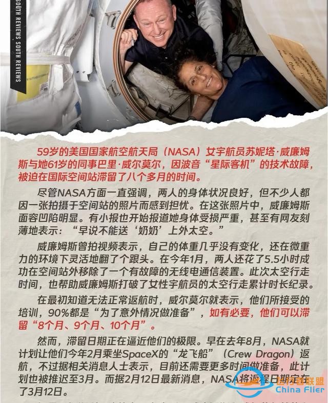 然而,正在国际空间站执行任务的美国宇航员威廉姆斯对此表示反对。她认为,国际空间站正处于“鼎盛时期”,许多重要的科学成果正在不断涌现,现在并非放弃它的合适时机。威廉姆斯和同事威尔莫尔于去年6月5日搭乘波音“星际客机”抵达空间站,执行首次载人试飞任务,但因飞船推进器故障和氦气泄漏等问题,返航时间一再推迟,最终于9月6日不载人返回地球。