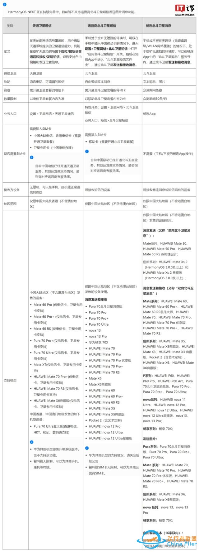 IT之家注意到,华为官网现更新了各机型卫星功能适配情况,其中华为 Mate 60 Pro+、nova 12 UItra 等机型已适配支持运营商北斗卫星短信功能。