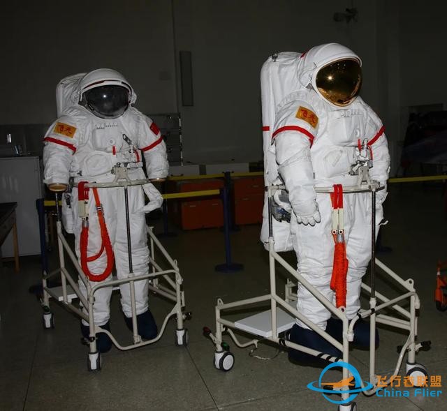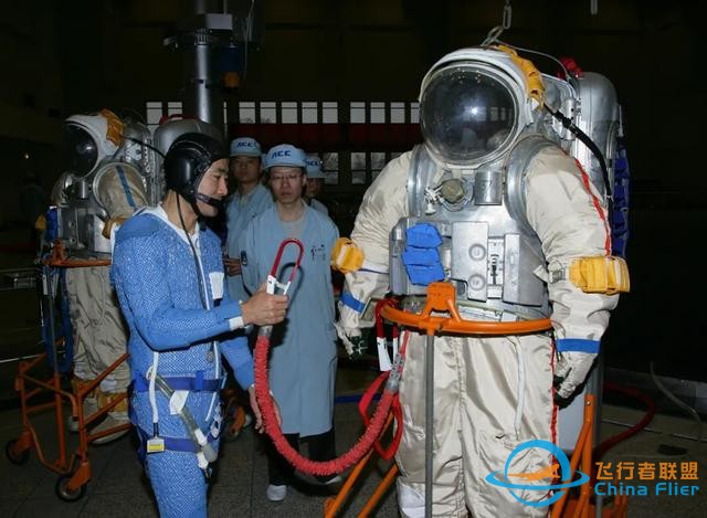 穿“飞天”服时要先把臀部放在航天服的背包沿上,接着双腿伸进航天服的下肢,然后关闭背包门,把自己裹在庞大的舱外服中。